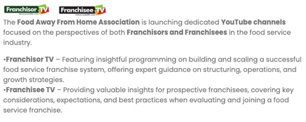 FOOD SERVICE FORMATS: The Food Away From Home Association’s founders have been involved in the Food Service industry (as suppliers, partners and media) for many years. Our new membership will include operators and franchisors as well as others such as food service providers, chains, distributors, associations and more. We are also expanding into healthy option ideas and introductions for their customers (smoothie, juice, boba tea and yogurt).